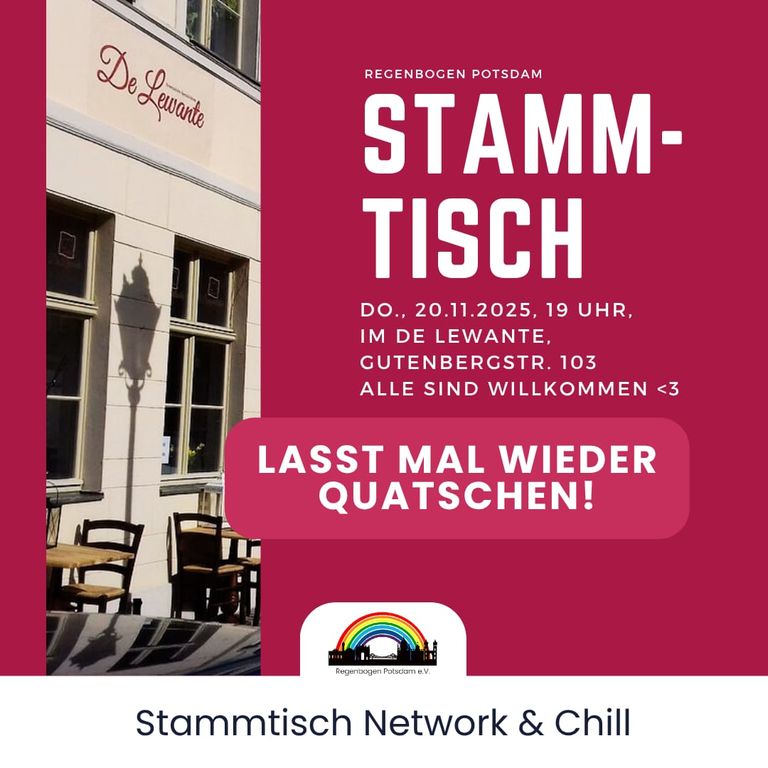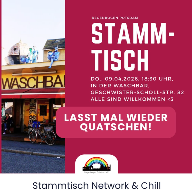 Wenn du regelmäßig, aktuelle Informationen zu queeren Veranstaltungen und News in und um Potsdam bekommen möchtest kannst du auch gerne unserem WhatsApp-Kanal oder unserem Telegramm-Kanal beitreten.